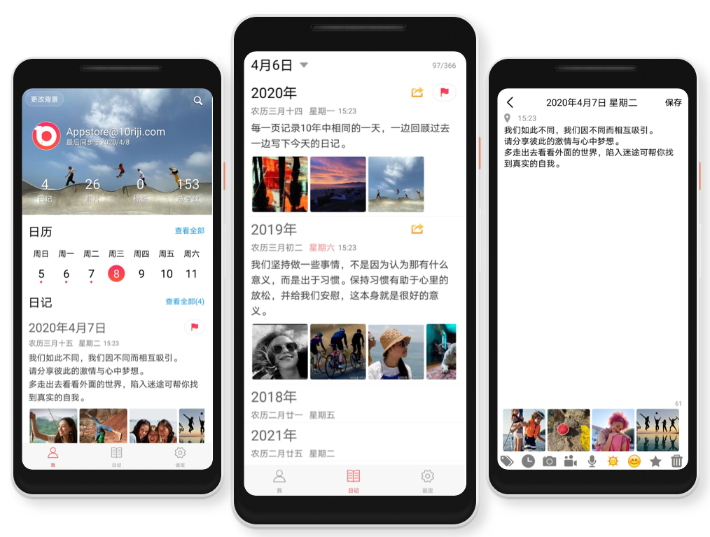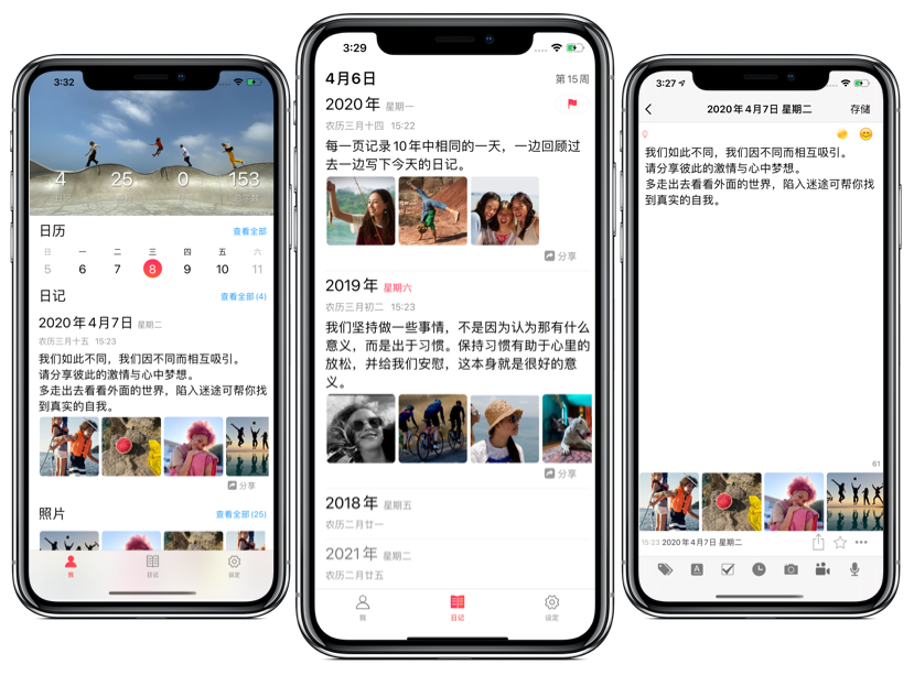 每篇日记不但可以添加多张照片,还可以为照片添加丰富的滤镜。我们会自动为您整理出日记相册。